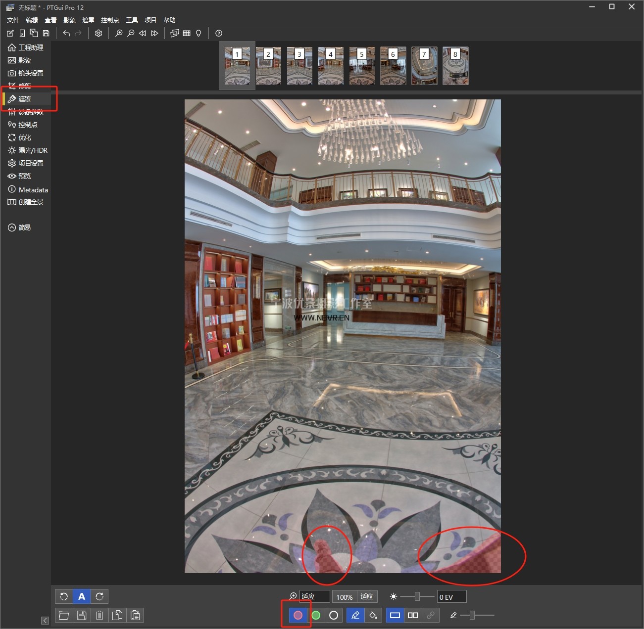 如上图:本次使用6+1+1模式拍摄,360度分6等份拍摄6张,顶部1张和地面1张。